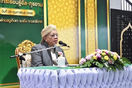 วันที่ 25 กุมภาพันธ์ 2568 เวลา 09.00 น. นายศุภโยค ลอดิง นายกเทศมนตรีตำบลบูเก๊ะตาให้การต้อนรับนายอรุณ บุญชม จุฬาราชมนตรี พร้อมป็นประธานในพิธีเปิดอาคารศูนย์การเรียนรู้อัลกุร-อานและพบปะผู้บริหารสถานศึกษาจังหวัดชายแดนภาคใต้ โดยมี ว่าที่ร้อยตรีตระกูล โทธรรม ผู้ว่าราชการจังหวัดนราธิวาส กล่าวต้อนรับ มีประธานกรรมการอิสลามประจำจังหวัดนราธิวาส ปัตตานี และยะลา นายอำเภอแว้ง หัวหน้าส่วนราชการ และประชาชนในพื้นที่ เข้าร่วมพิธีฯ ทั้งนี้ นายอรุณ บุญชม จุฬาราชมนตรี ได้กล่าวขอบคุณผู้ที่มีส่วนร่วมสนับสนุนทำให้เกิดอาคารศูนย์การเรียนรู้อัลกุร-อานแห่งนี้ขึ้น ซึ่งจะเป็นสถานที่ของการศึกษาและเรียนรู้พระมหาคัมภีร์ อัล-กุรอานในพื้นที่ ทั้งนี้พระบาทสมเด็จพระบรมชนกาธิเบศรมหาภูมิพลอดุลยเดชมหาราช บรมนาถบพิตร (ในหลวงรัชกาลที่ 9) ทรงมีพระราชดำริให้ นายต่วน สุวรรณศาสน์ จุฬาราชมนตรีคนที่ 15 ได้แปลความหมายของพระมหาคัมภีร์อัลกุรอานออกมาเป็นภาษาไทย เพื่อให้พี่น้องประชาชนได้ศึกษาเรียนรู้ การอ่านอัลกุรอาน พร้อมทั้งรู้ความหมายเพื่อได้นำไปปฏิบัติอย่างถูกต้อง เพราะอัลกุรอ่านเป็นวิถีชีวิตของมุสลิมทุกคน และในอัลกุรอานซึ่งมีทั้งหมด 6,236 อายัต มีเรื่องราวทั้งที่เป็นวิทยาศาสตร์ บทบัญญัติของศาสนา และประวัติความเป็นมาของคนในยุคก่อน มีหลักศรัทธา คุณธรรม จริยธรรม การอยู่ร่วมกันของผู้คน ดังนั้นถ้าเราได้นำสิ่งเหล่านี้มาศึกษาเรียนรู้ควบคู่ไปกับการอ่านก็จะยิ่งทำให้มีความรู้กว้างขวางยิ่งขึ้น และในวันนี้เราทั้งหลายได้มาร่วมในการเปิดศูนย์การเรียนรู้กุรอานแบบระบบกีลออาตี ซึ่งเป็นการคิดค้นขึ้นใหม่โดยนักวิชาการเพื่อให้การอ่านอัล-กุรอานอ่านได้เร็วขึ้น และเป็นที่นิยม รวมทั้งเป็นยังการกระตุ้นให้เยาวชนในพื้นที่รักการอ่านอัล-กุรอานได้มากขึ้นด้วย พร้อมกันนี้ขอชื่นชมผู้ว่าราชการจังหวัด ตลอดจนส่วนราชการทุกภาคส่วนของจังหวัดนราธิวาส ที่ได้ร่วมกันสนับสนุน แม้เราจะนับถือศาสนาที่แตกต่างกัน แต่ก็สามารถอยู่ร่วมกันได้แบบพหุวัฒนธรรมโดยไม่แบ่งแยก ทั้งนี้เรามีพระบาทสมเด็จพระเจ้าอยู่หัวฯ ที่ทรงเป็นอัครศาสนูปถัมภก ที่ให้การอุปการะอนุเคราะห์ในทุกศาสนาโดยเท่าเทียมกัน และในโอกาสใกล้เข้าสู่ช่วงเดือนรอมฎอน เดือนอันประสริฐ ก็ขอให้ทุกบ้าน ทุกมัสยิดได้ใช้ช่วงเวลานี้ทบทวนอัล-กุรอาน เพื่อเพิ่มพูนความรู้และนำไปสู่การปฏิบัติได้อย่างกว้างขวาง ต่อไป