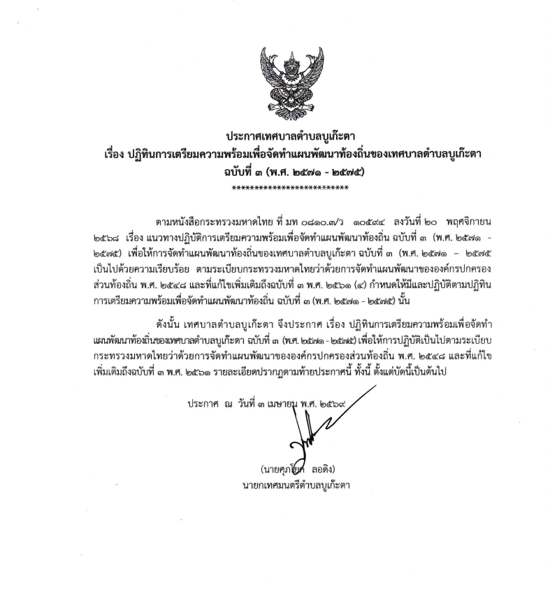 ประกาศ ทต.บูเก๊ะตา เรื่องปฏิทินการเตรียมความพร้อมเพื่อจัดทำแผนพัฒนาท้องถิ่นของเทศบาลตำบลบูเก๊ะตา ฉบับที่ 3 (พ.ศ.2571 - 2575) ดาวน์โหลด